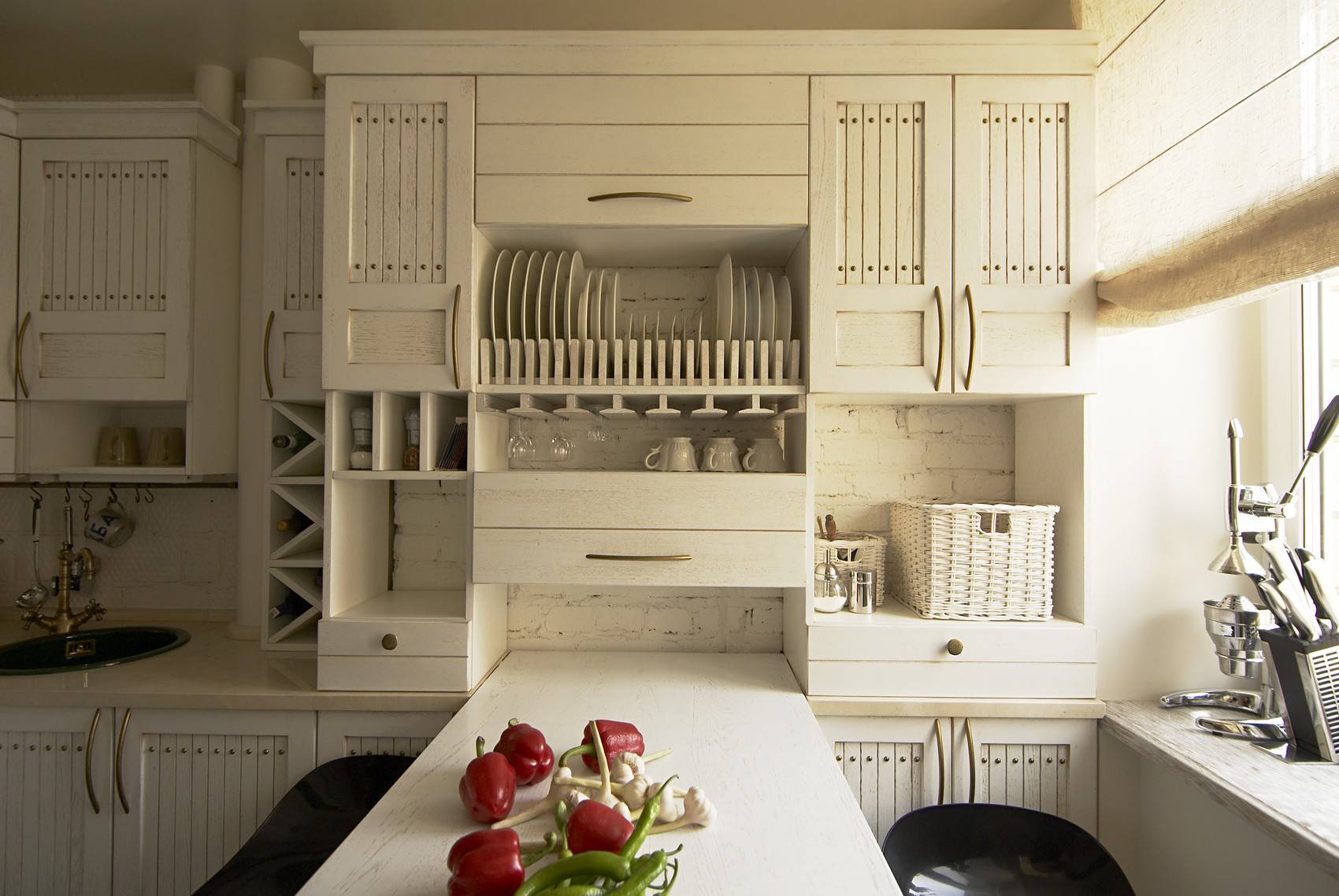 Небольшие навесные полочки под шкафчиками удобны для хранения приправ, чашек и другой посуды, которая используется каждый день.
