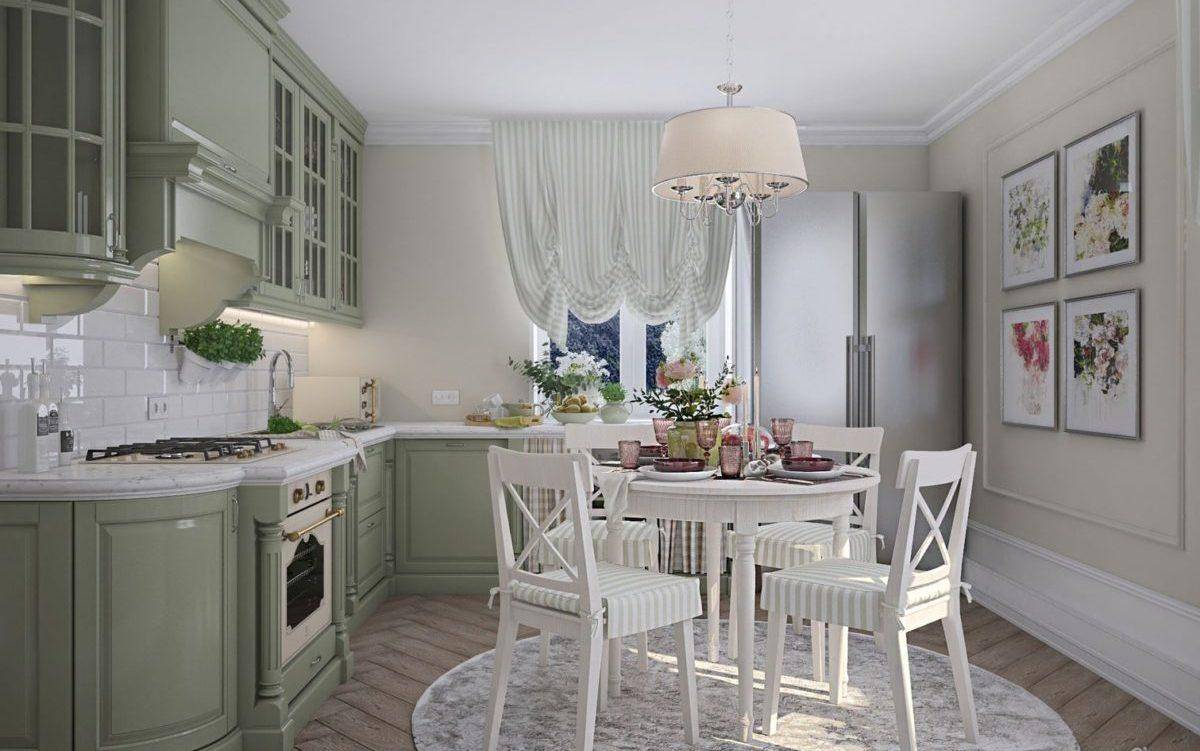 Белый цвет — можно сказать, что это классический вариант оформления подобной кухни. Белыми на ней могут быть стены, потолок, обеденный стол, фасады мебели. Чтобы помещение не выглядело стерильным и безжизненным, стоит добавить светло-голубых, бледно-желтых, фисташковых, серых или лавандовых оттенков.