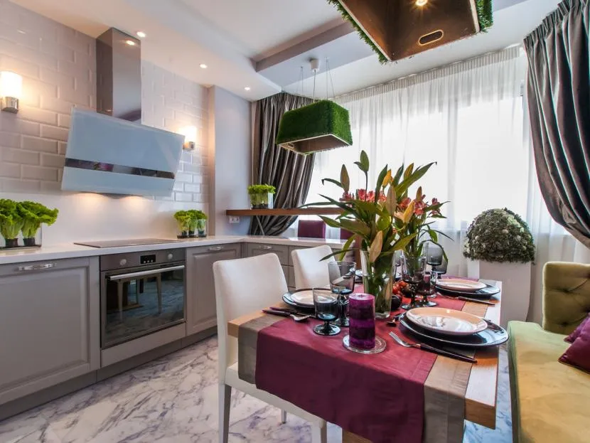 Расположение обеденной группы зависит не только от габаритов кухни, но и от её пропорций. Окружённый стульями стол может оказаться в следующих частях помещения: