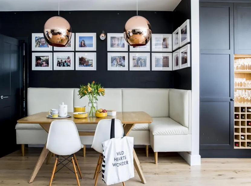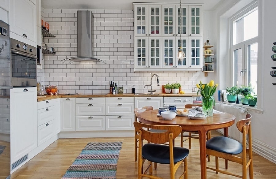 В углу. В небольшой комнате стол, стоящий вплотную к углу, – единственный способ сэкономить пространство и максимально отдалиться от плиты. Хорошо, если у стены за столом можно поставить угловой диван. Угловые модели комфортны и вместительны, к тому же более практичны, чем стулья: они дополнительно оборудованы ящиками для хранения.