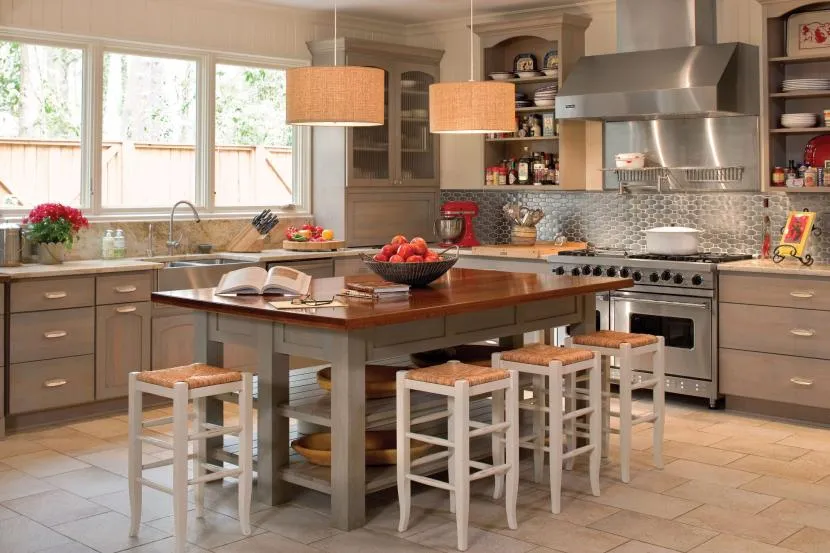 Если кухня небольшая по площади, но широкая (или обеденная зона вынесена из кухни) можно сделать в ее центре остров – туда можно вынести даже холодильник или раковину, а можно обойтись открытыми стеллажами.
