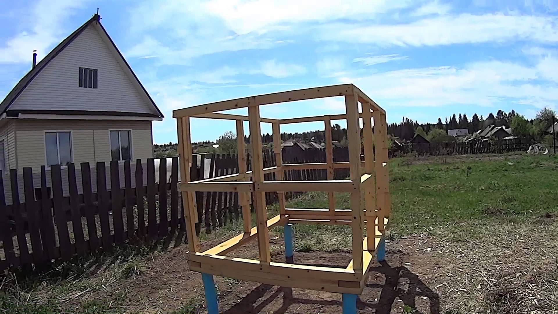 Такую конструкцию нужно возводить на точечном фундаменте. Для каркаса использовать брус. Обшивать стены можно рейкой или доской ОСБ