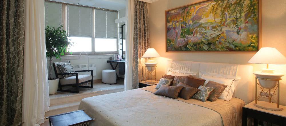 С помощью комбинированного освещения можно актуализировать зоны в спальне. Выделить прикроватную зону настольными лампами, бра на стене, светодиодной подсветкой. Большая люстра осветит всю площадь комнаты. Балконная зона должна освещаться отдельно.