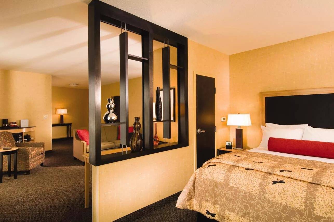 Есть один нетривиальный вариант того как можно выделить зону спальни в гостиной: сделать подиум, на который вынести какую-то зону. Там можно расположить, например, несколько кресел и кофейный столик или поставить диван. Под подиум задвигать кровать.