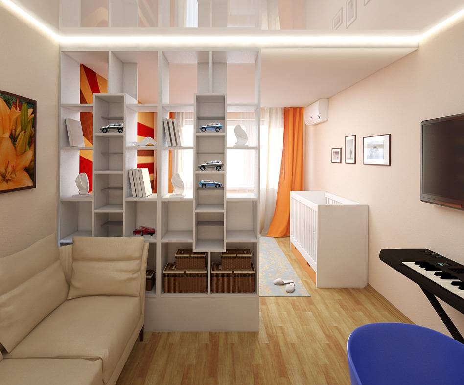Чаще всего при таком методе деления комнаты применяют стеллаж или шкаф. В случае со стеллажами желательно использовать такие, которые имеют сквозные полки.