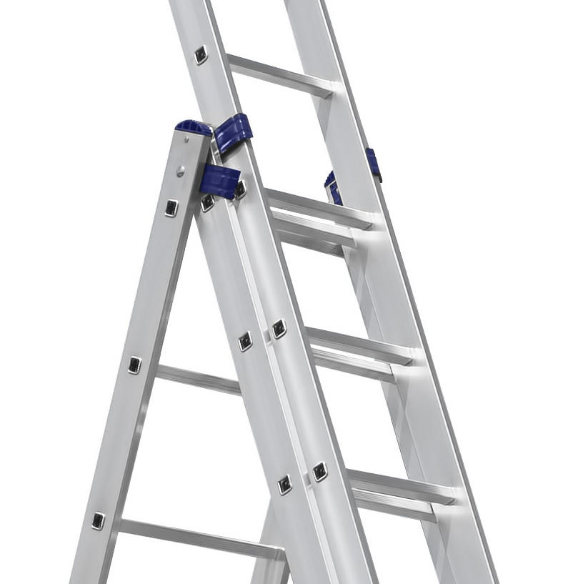 Тросовая тяга и фиксаторы позволяют оперативно разобрать трехсекционную лестницу на нужную высоту (максимум – 10,58 м). Наличие механизма предопределяет ее профессиональное использование. Учитывая самую дорогую стоимость в рейтинге, ALUMET 3315 в качестве инвентаря для дома мало кто станет рассматривать. Она больше подходит для проведения внешних работ по монтажу, в строительстве, а также может использоваться спасательными или пожарными бригадами, давая возможность забраться на крышу трехэтажных домов или балконы. Благодаря алюминиевому профилю весит самая длинная лестница всего 38,7 кг. При этом высота одного пролета составляет 4,4 м, что следует учитывать при транспортировке.