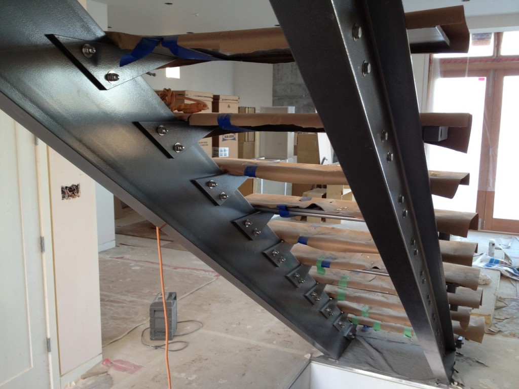 Когда все металлические конструкции установлены в проектное положение и приварены, можно производить укладку ступенек по стальным косоурам. Последовательность работ такая: