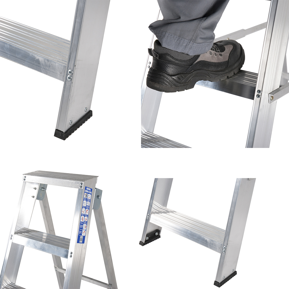 - Двусторонняя лестница-стремянка имеет резиновые башмаки с двух сторон. И складывается в удобную двустороннюю лестницу.
