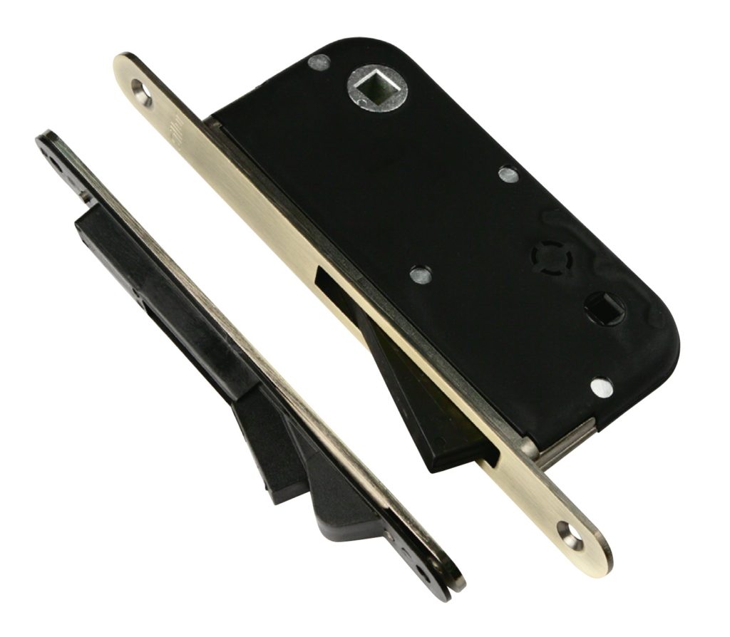 Это связано с высокой надежностью фиксации полотна. Конструкция усложнена механическими элементами. Внешне практически не отличимые от традиционных. Отличие заключается в отсутствии прижимной пружины. Ригель изготовлен из намагниченного металла, во время закрытия он самостоятельно проникает в подготовленный на планке паз. Нажатие на ручку вызывает разъединение магнитов и открытие полотна. Пользователи отмечают бесшумную работу и классическую схему установки, которая не вызовет затруднений. Согласно заверениям производителей, ригель сохраняет свойства на протяжении 10 лет. В подтверждение своих слов они дают соответствующую гарантию. Следует отметить тот факт, что скрытая защелка — это нормальное состояние механизма. Весомое преимущество над классическими моделями.
