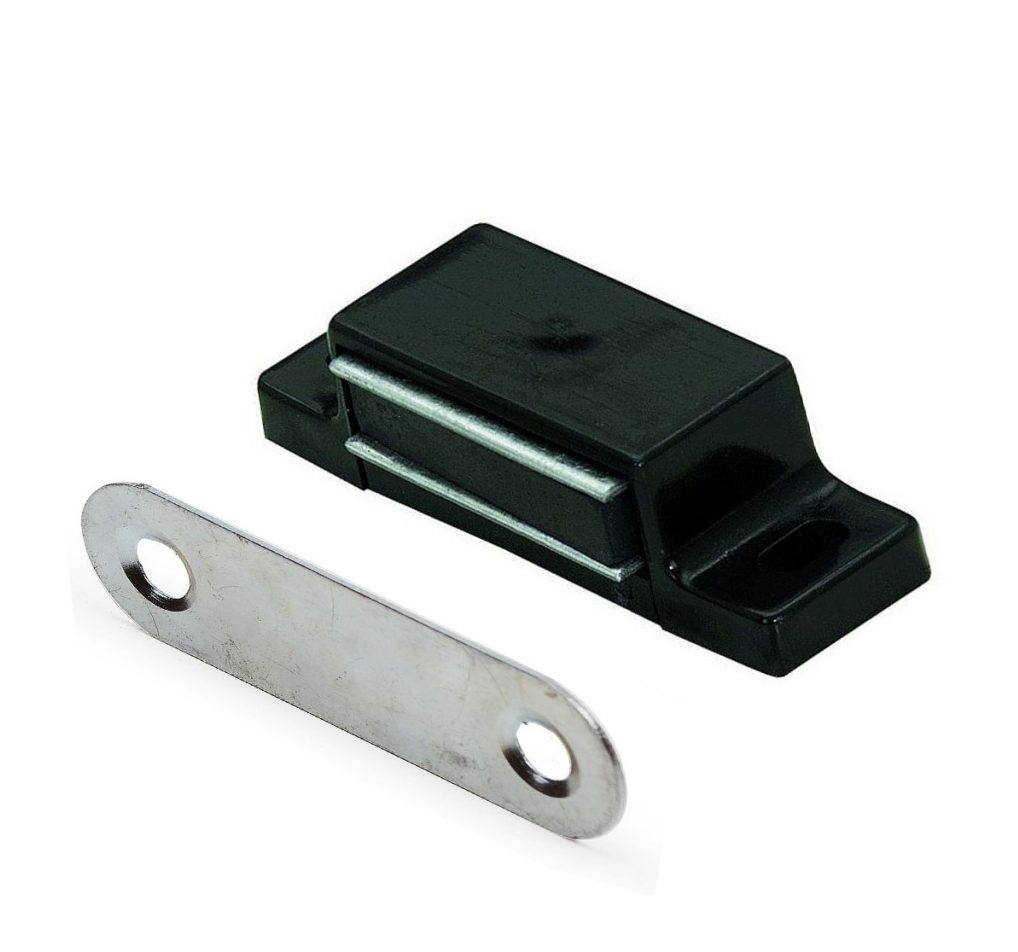 Простой пассивный замок.На дверное полотно крепится металлическая пластина, а к дверной коробке магнит. Отсутствуют выдвигающиеся части. Нет задвижки, поэтому подходит в качестве мебельной фурнитуры или для легких дверей. Этот вид устройств прост в монтаже, так как не требует врезки в дверное полотно.