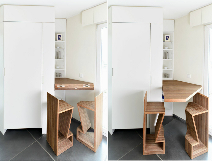 Обеденный стол можно заменить на складной, монтирующийся в стену. В сложенном виде он не занимает много места и является полкой. То же самое касается и стульев наподобие дачных. Еще есть вариант шкафа-трансформера, у которого дверца при желании превращается в полноценную поверхность. В качестве обеденного стола или места для перекуса также можно использовать столешницу или барную стойку. Подобный интерьер выглядит стильно и современно, особенно в сочетании с высокими стульями.