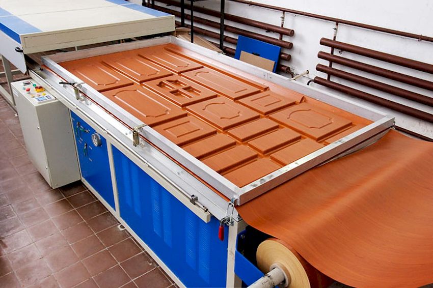 - Создание нужного декора. Для этого поверхность облицовывается бумагой со специальной пропиткой. Благодаря нагреву, слой проникает в лицевую часть листа, и образуется полимерная пленка.