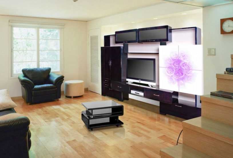 В современных гостиных уместна игра на контрасте. Сама популярная комбинация — черный с белым. Для небольшой комнаты или студии подойдут модульные гостиные с угловым шкафом — использование углов экономит ценное пространство.