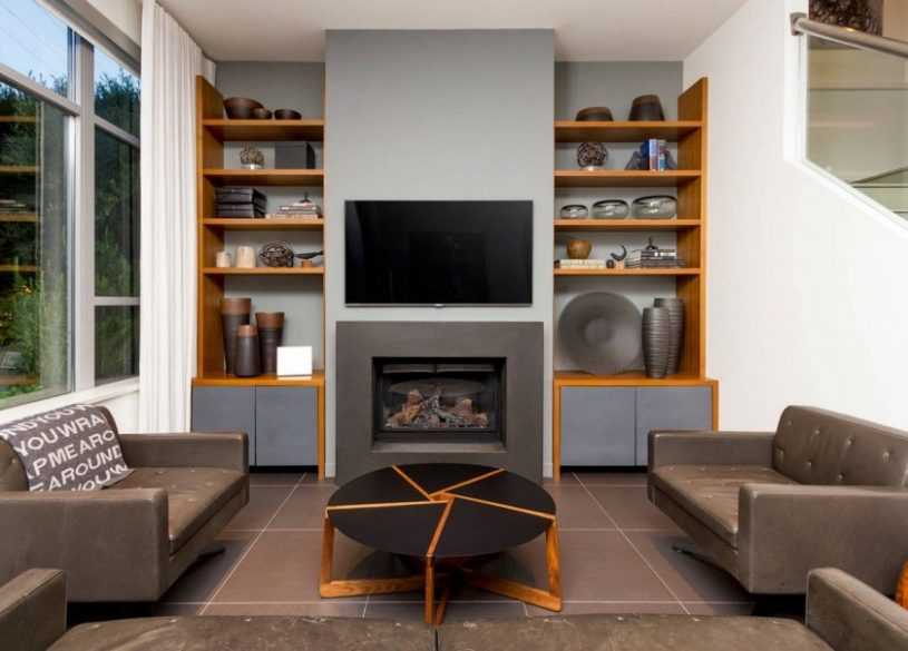 Для оживления обстановки достаточно добавить раскидистую сухую ветку, помещенную в бежевую вазу напольного типа. В современном дизайне гостиной ветка может быть заменена двумя шарами перекати-поля, симметрично выставленными по бокам от плазменной панели.