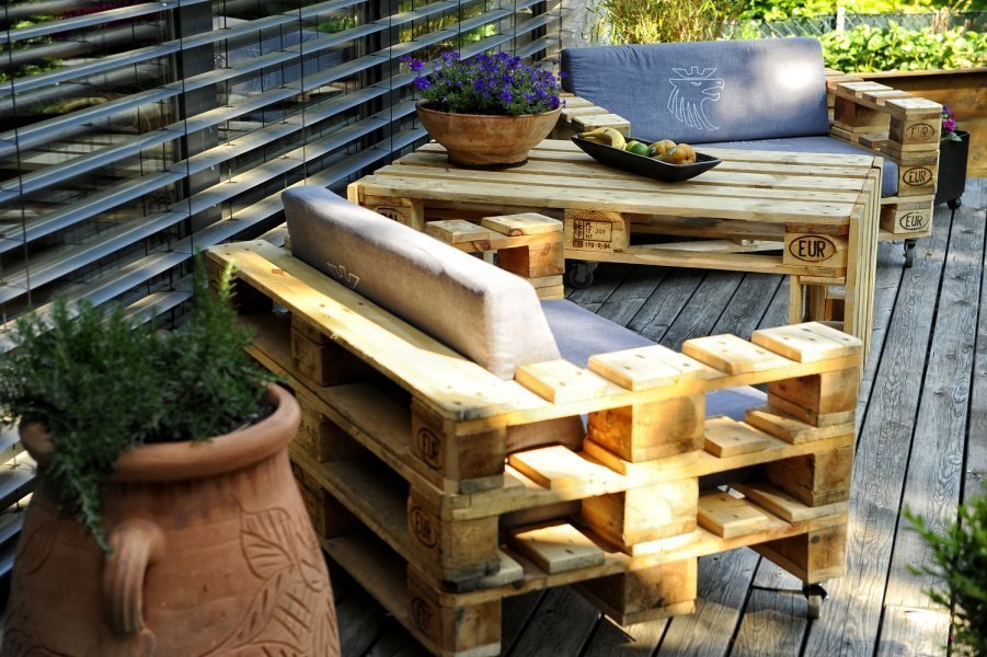 Для мебели на дачном участке поддоны в цельном виде либо разобранные на доски — идеальный материал. Ведь здесь главную роль играет не дизайн, а практичность.