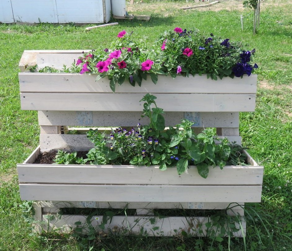 Деревянными европоддонами, с посаженными в них цветами, декорируются дачные беседки, балконы в квартире, наружные стены частных домов. Такая клумба значительно экономит пространство. В зависимости от планируемого размера клумбы, для ее изготовления потребуются одна и более штук, специальный геотекстиль, степлер для мебели, рассада или семена цветов. Предпочтительны для вертикальной посадки петунии, бархатцы, пряные травы, клубника, земляника. Паллет шлифуется, покрывается краской. Задняя, нижняя, боковые части обтягиваются ландшафтной тканью с помощью степлера. Потом он переворачивается на «спину», внутрь засыпается почвенная смесь. Можно сделать иначе: не обивать тканью весь поддон, а устроить «карманы». Потом туда сажают цветы, начиная с нижнего ряда. Через 10-15 дней растения достаточно укоренятся, клумбу можно ставить вертикально.