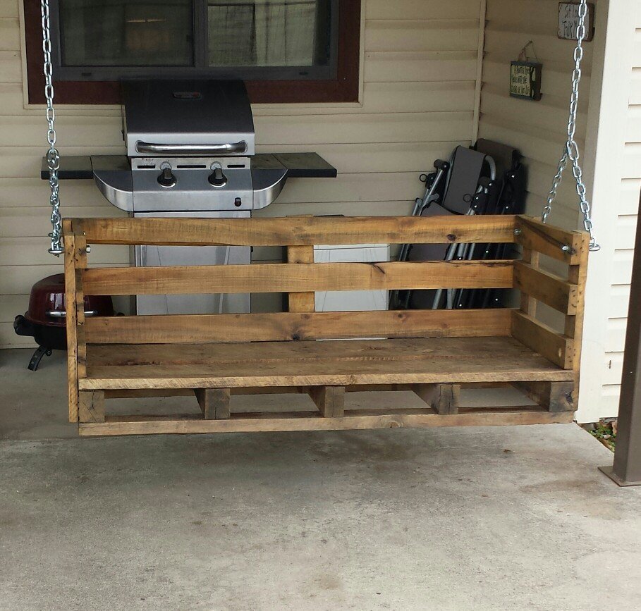 Для изготовления оригинальных качелей для детей и взрослых, понадобится один-два европоддона, несколько метров крепкой стальной цепи. Конструкция подвешивается на металлическую перекладину, каркас. Это обычно качели со спинкой или в виде подвесной кровати с матрасом. Каркас тоже может быть изготовлен из частей поддонов, если сделать дополнительные ребра жесткости, небольшой навес. На подобной конструкции иногда крепят подвесные площадки для детских игр. При изготовлении качелей следует учитывать, какой они выдержат вес, но обязательно с «запасом».