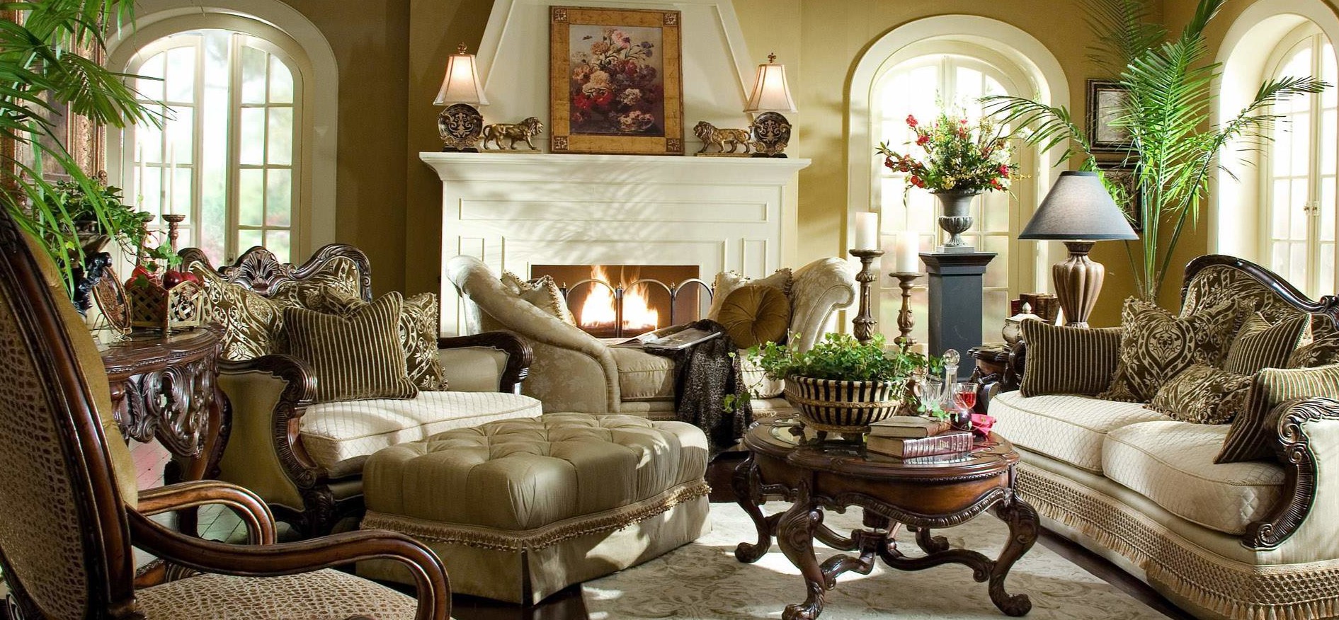 Каминную полку, столики, консоли украсят старинные канделябры, вазы, бронзовые статуэтки, шкатулки. Все эти предметы декора должны быть расставлены со вкусом, не нарушая единой композиции, которой требует гостиная в классическом стиле.