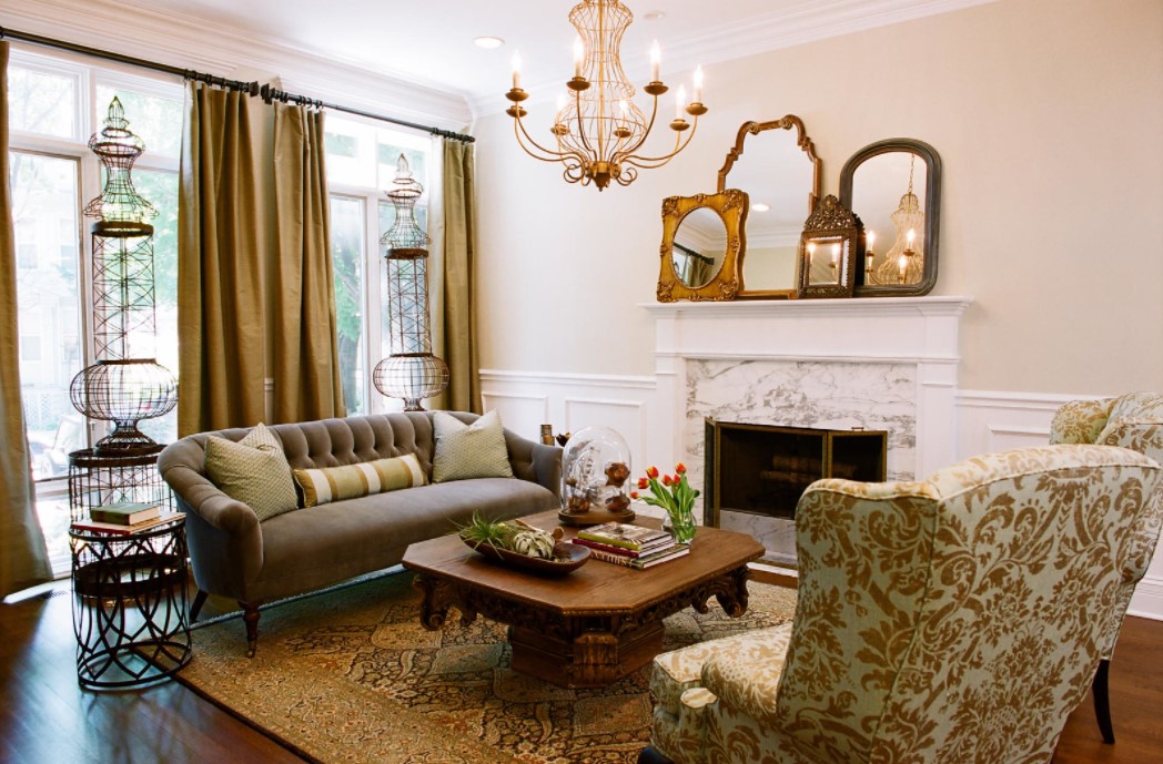 Классический антураж гостиной гармонично подчеркивают предметы антиквариата, статуэтки, живопись, использование в палитре золотистых оттенков.