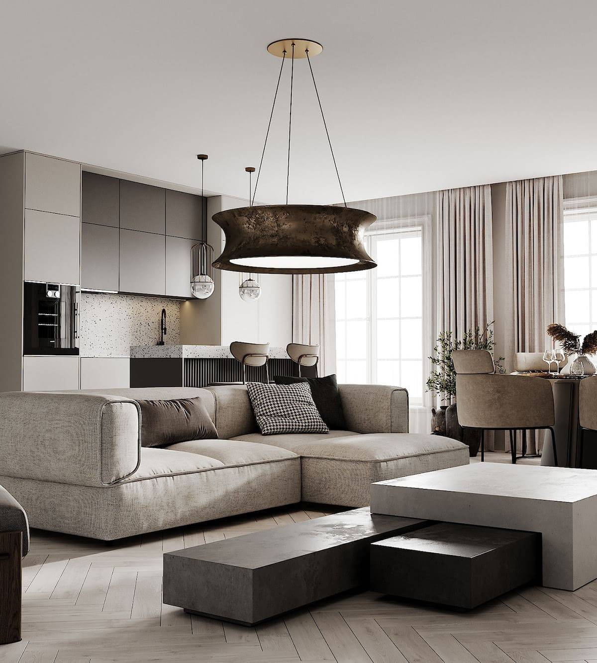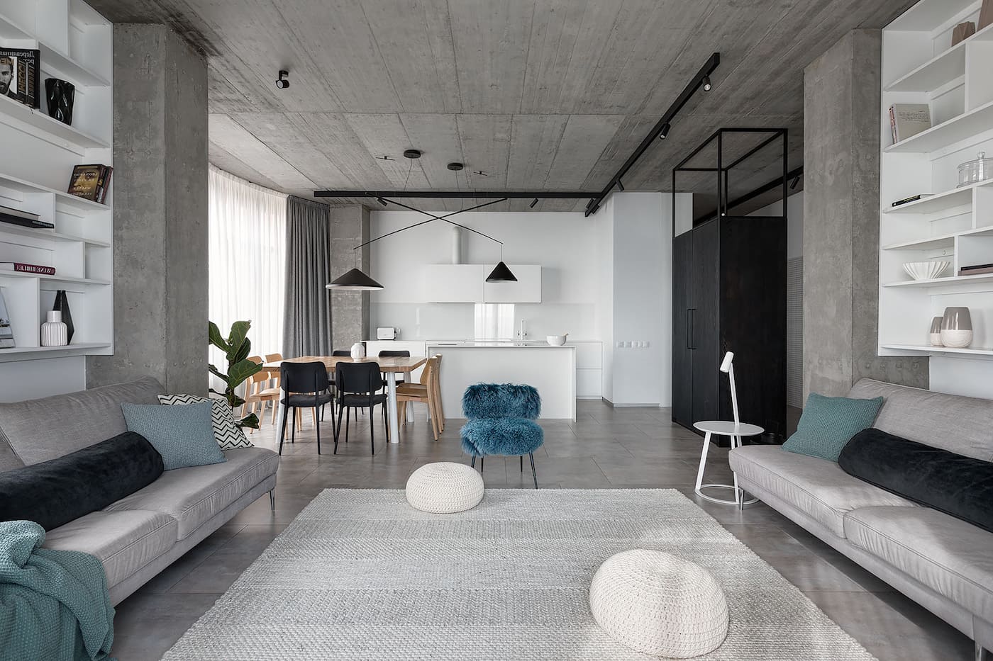 Так создаются современные схемы освещения, которое должно быть многоуровневым, чтобы создать интересный световой эффект и осветить все части комнаты. Желательно выбирать светильники предельно простых геометрических форм или столь популярные сейчас лампы Эдисона, которые светят исключительно в теплом спектре.