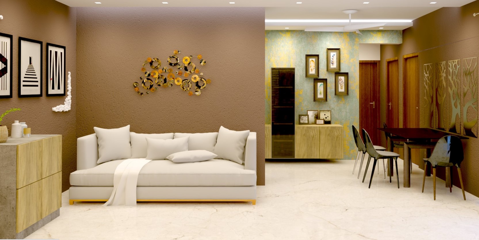 Бежевый диван отлично гармонирует с коричневой мебелью в интерьере