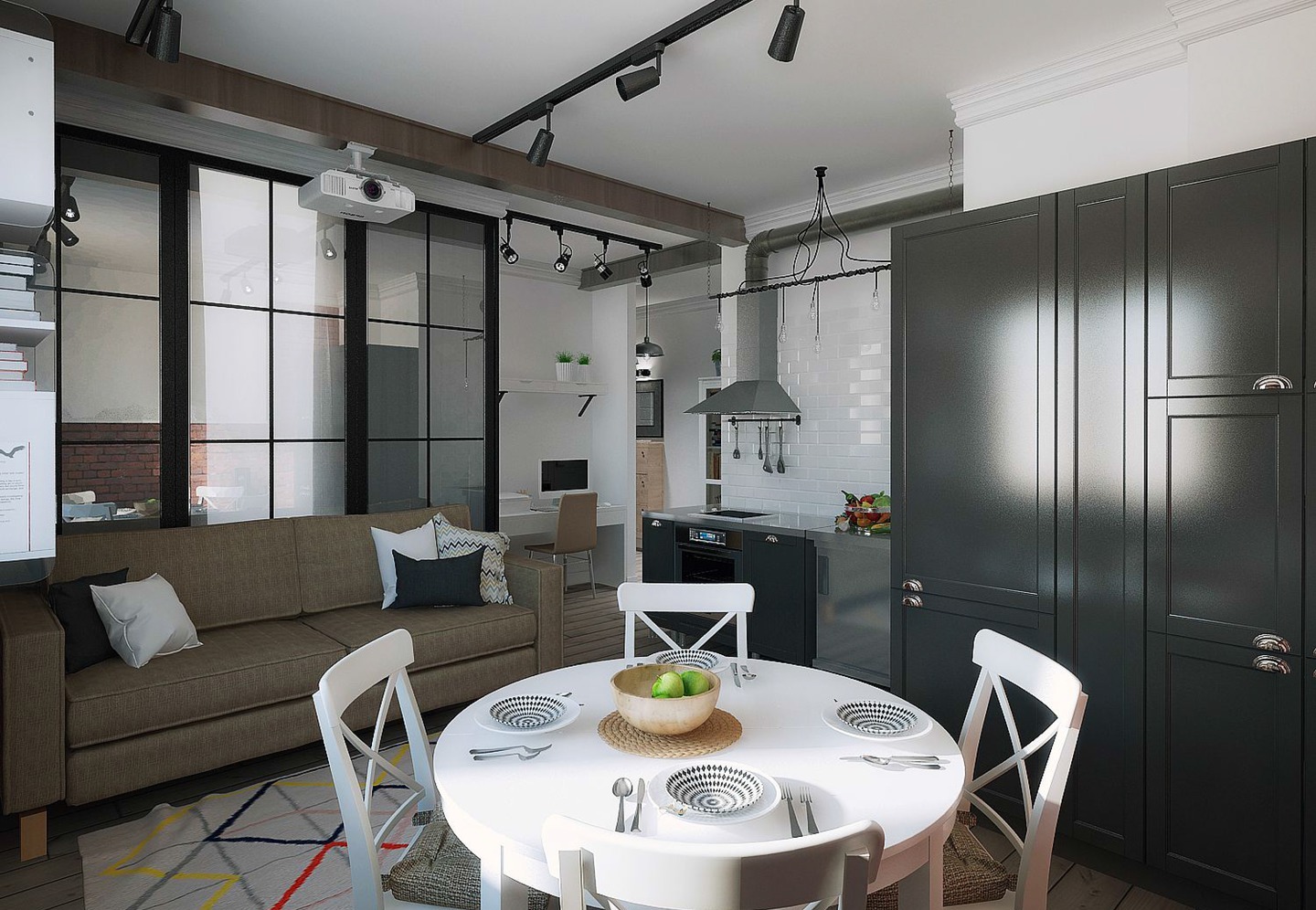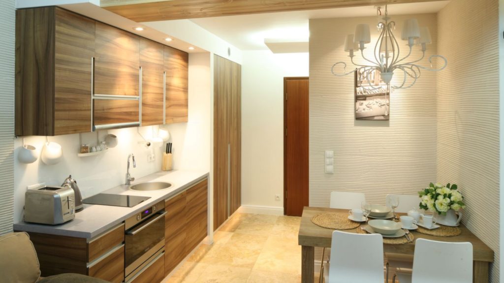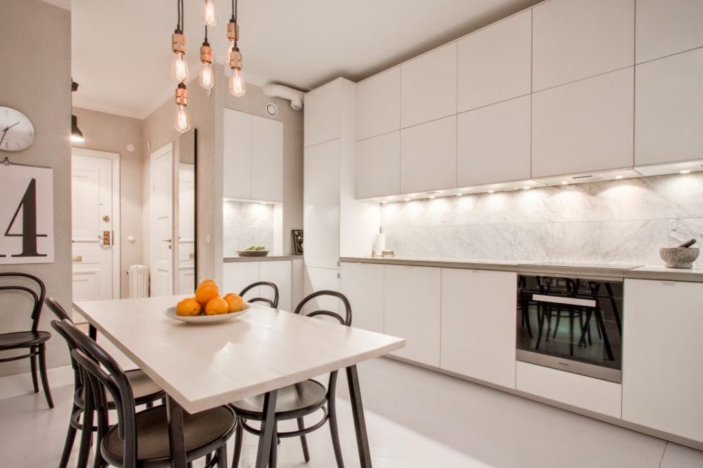 Световой сценарий должен поддерживать зонирование. У входа можно установить зеркало с подсветкой и несколько точечных светильников у шкафа. Рабочая поверхность в кухонной зоне должна быть хорошо освещена, для этого подойдут трековые светильники или в случае островного размещения кухни – несколько плафонов на длинном шнуре;