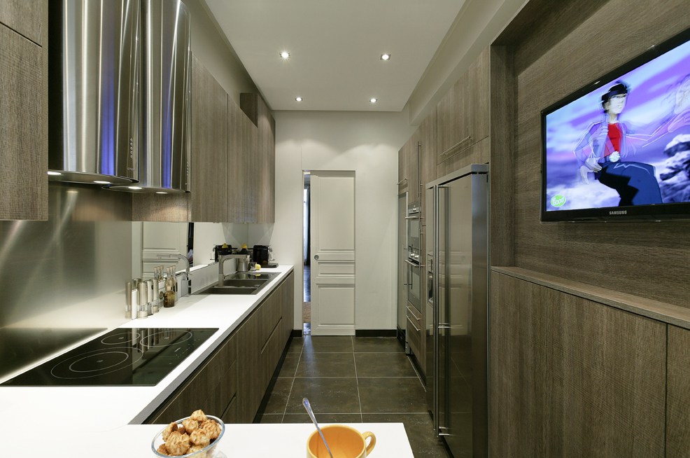 На фото двухрядная планировка проходной кухни, соединенной с коридором.