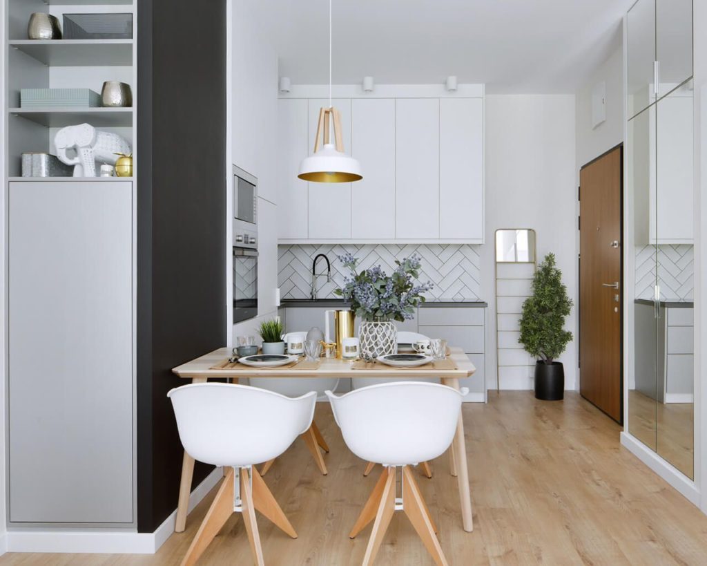Если даже после перепланировки пространство кухни-прихожей остается маленьким и не очень светлым, то оригинальным решением станет использование зеркал. Они не только разобьют комнату на зоны, но и будут отражать свет, наполнив им помещение и визуально увеличив его.
