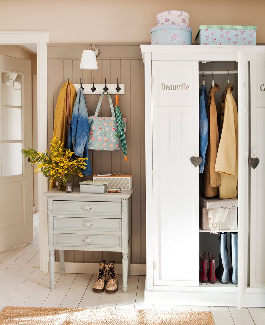 Красить вешалки и шкафчики в пастельные тона не обязательно, в интерьер маленького пастельного коридора впишется любой предмет мебели из светлого дерева.