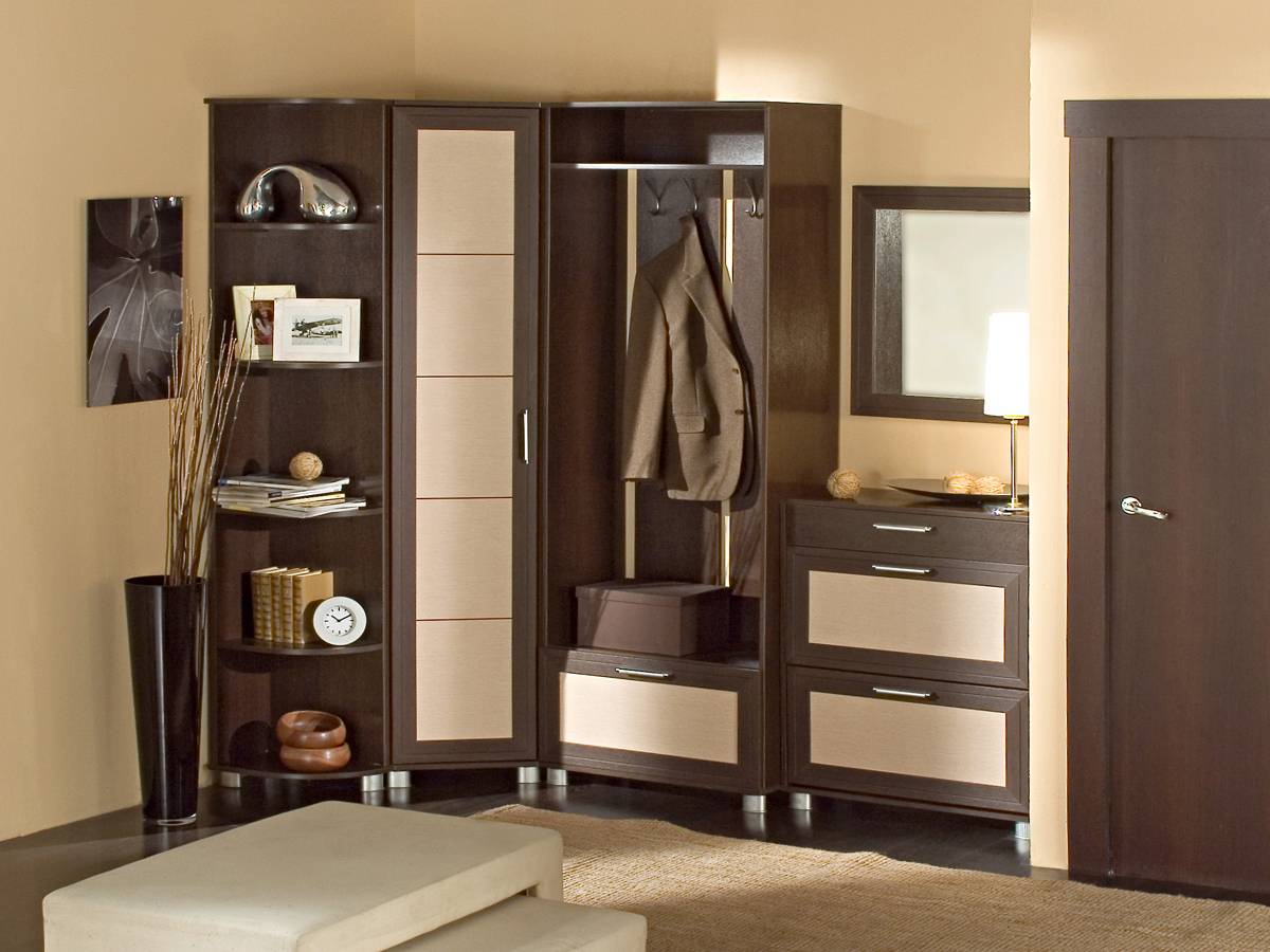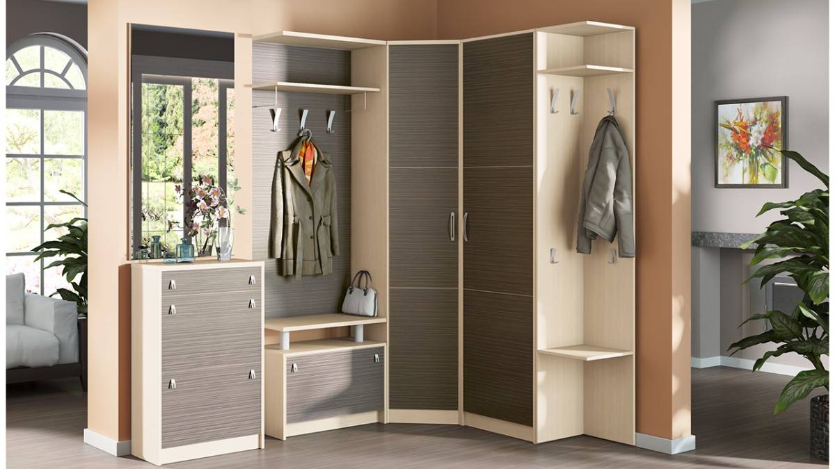 Планировка квартир с коридором, в котором образуется свободный угол, наиболее простая для подбора мебели. Нестандартная задача позволяет проявить фантазию и дизайнерские навыки. Угол прихожей обставляют с помощью встроенного шкафа. Гарнитур с небольшой банкеткой позволит увеличить функционал, а отдельные дизайнерские предметы добавят интерьеру особенного настроения. Главное, чтобы угол не казался загромождённым, или им было неудобно пользоваться.