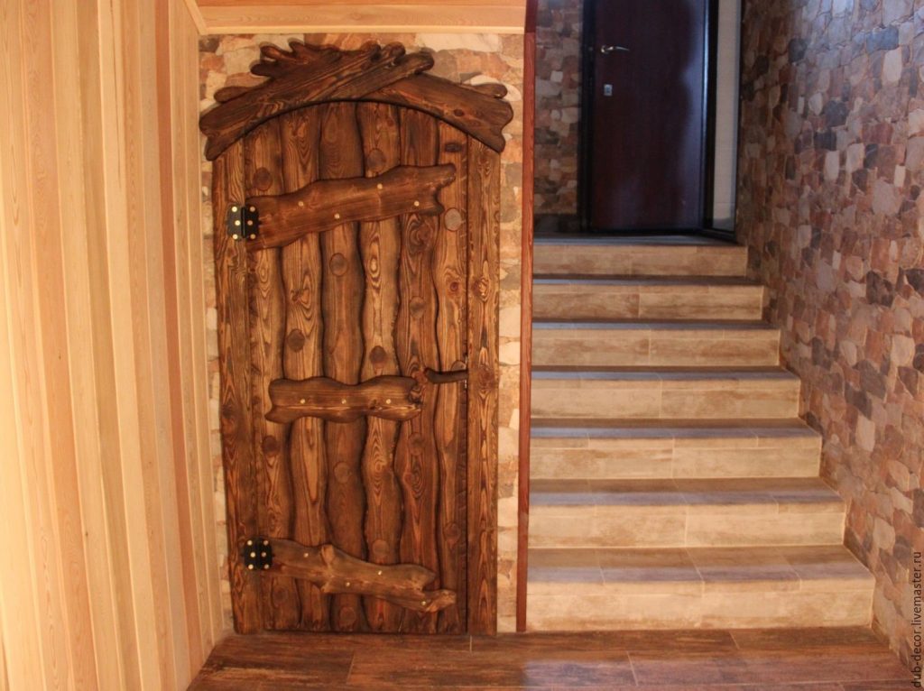 Если внутренняя отделка дачного дома выполнена из вагонки, лучшим решением будет покрыть дверь морилкой и покрасить в цвет интерьера.