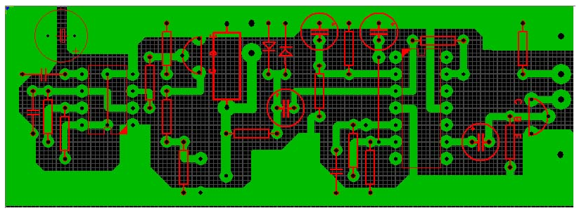 Для размещения радиодеталей используется печатная схема, которую можно легко изготовить самостоятельно. Для этого используем кусок листового гетинакса, покрытого медной электротехнической фольгой. На неё переносим соединяющие детали, размечаем места креплений, просверливаем отверстия. Дорожки покрываем защитным лаком, а после высыхания опускаем будущую плату в хлорное железо для травления. Это необходимо для удаления незащищённых участков медной фольги.