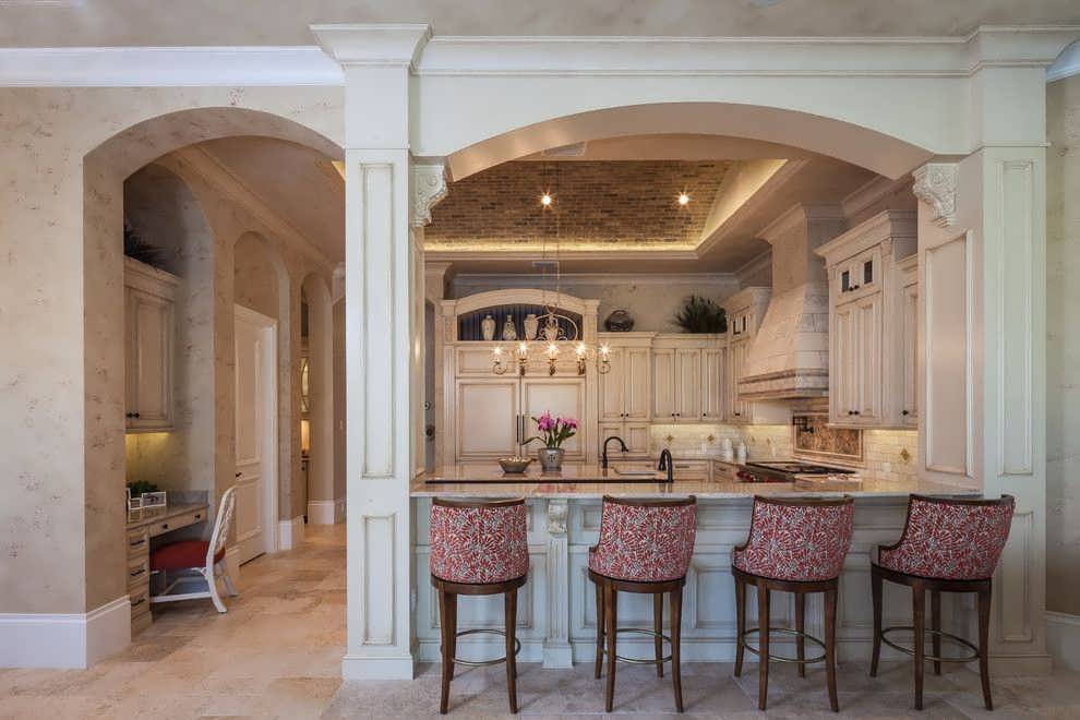- Фигурный свод в большой кухне желательно акцентировать в контрастных тонах. Эффектно смотрится отделка структурной штукатуркой.