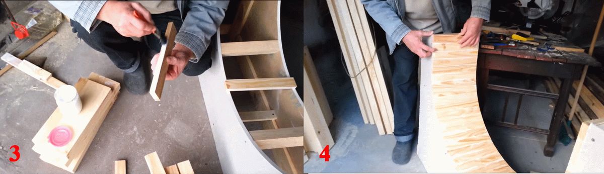 Теперь приступаем к изготовлению арочного наличника. Для этого доску нарезаем на небольшие кусочки и выкладываем так, чтобы они совпадали с радиусом арки. После чего склеиваем их между собой.