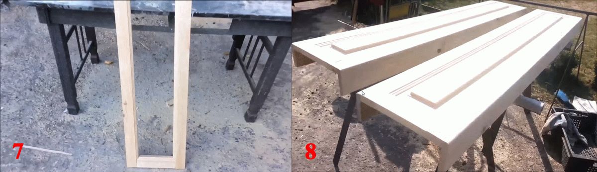 Приступаем к изготовлению боковых стоек. Для этого ручным фрезером нужно сделать обвязку. После чего делаем филенки, которые вставляем в обвязку и проклеиваем. Крепим вертикальный наличник. Из 3-х частей склеиваем обводку.