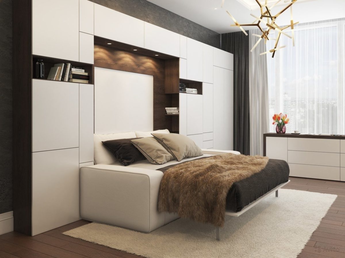 В интерьере спальни с гостиной площадью менее 15 кв. м будет уместна мебель-трансформер. Эти изделия экономят пространство, так как занимают меньше места.
