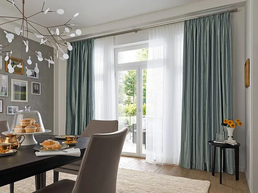 В обеденной зоне уместно повесить минималистические портьеры и тюль.