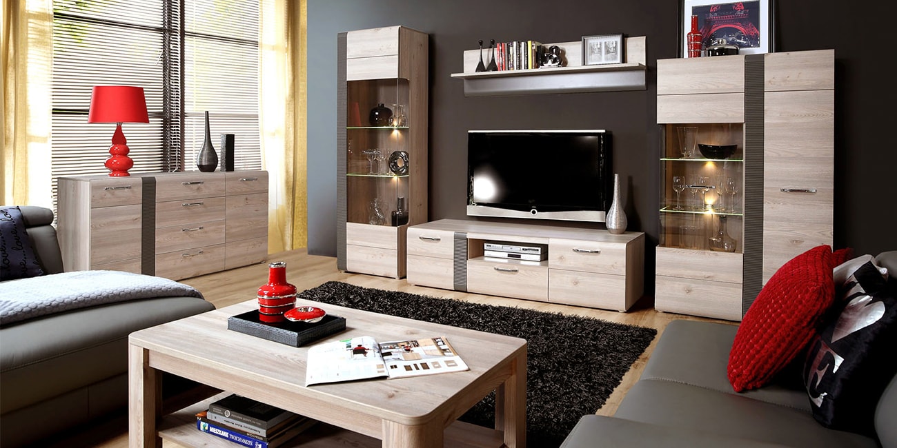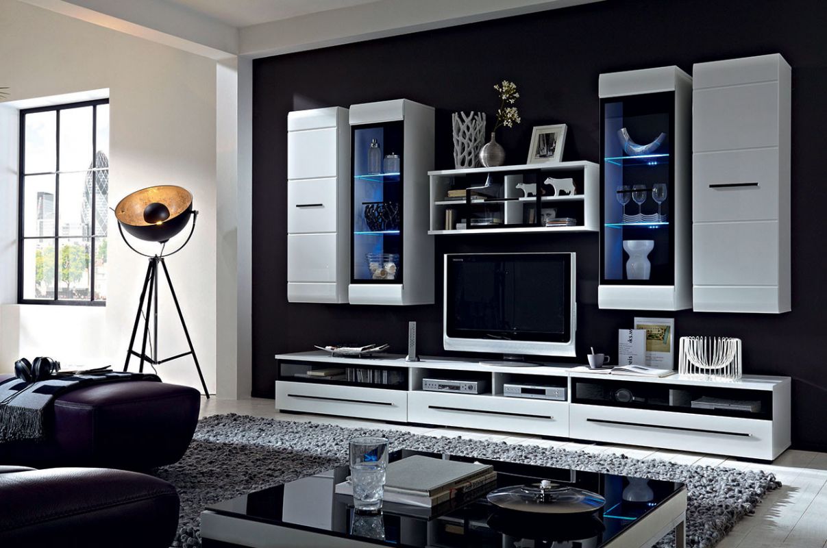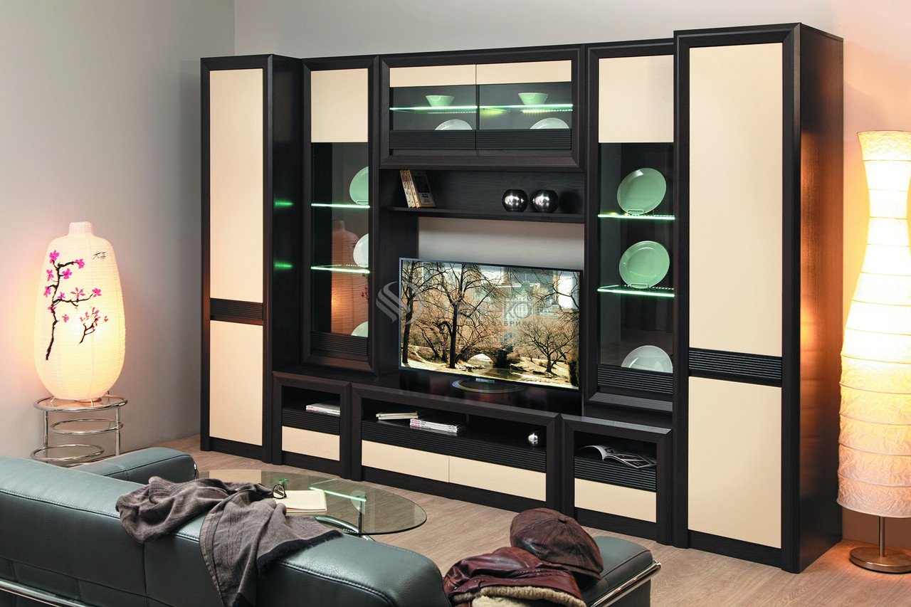 Современную стенку в гостиную из модулей можно приобрести в салонах — как отдельными модулями, так и полным комплектом. Чаще всего такая процедура осуществляется под заказ.