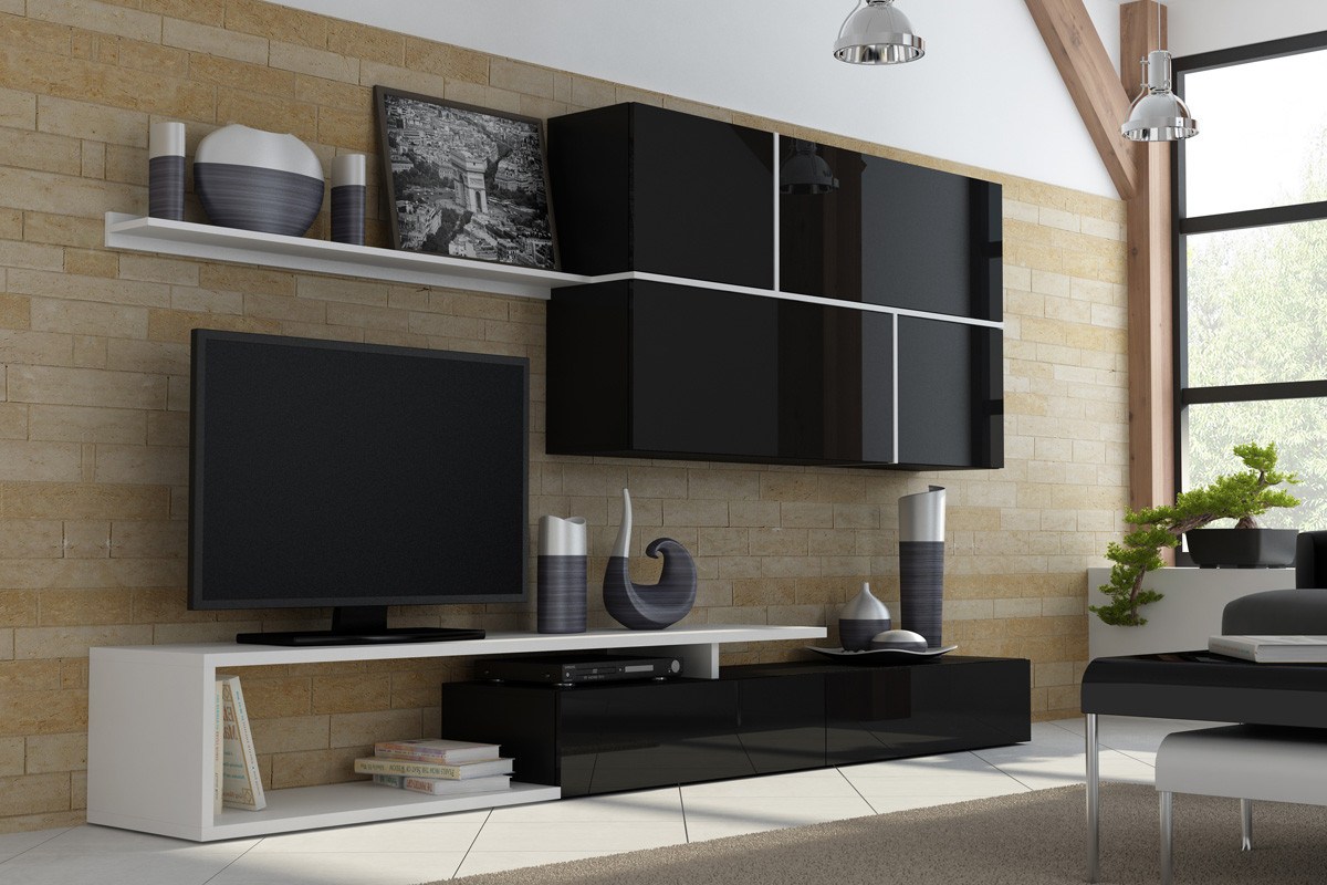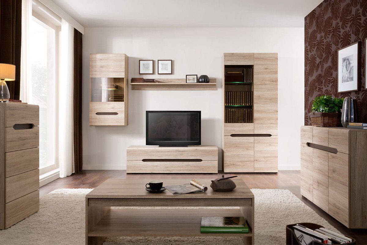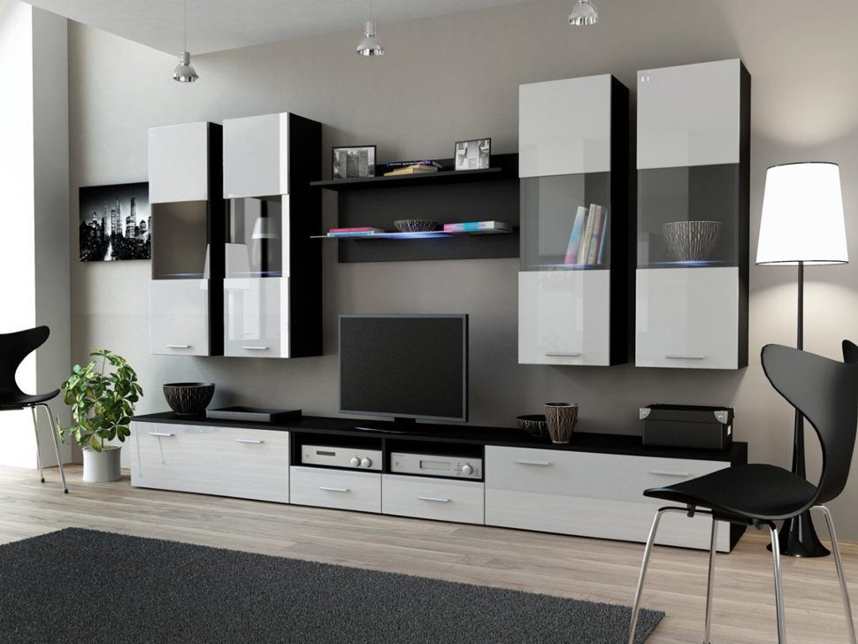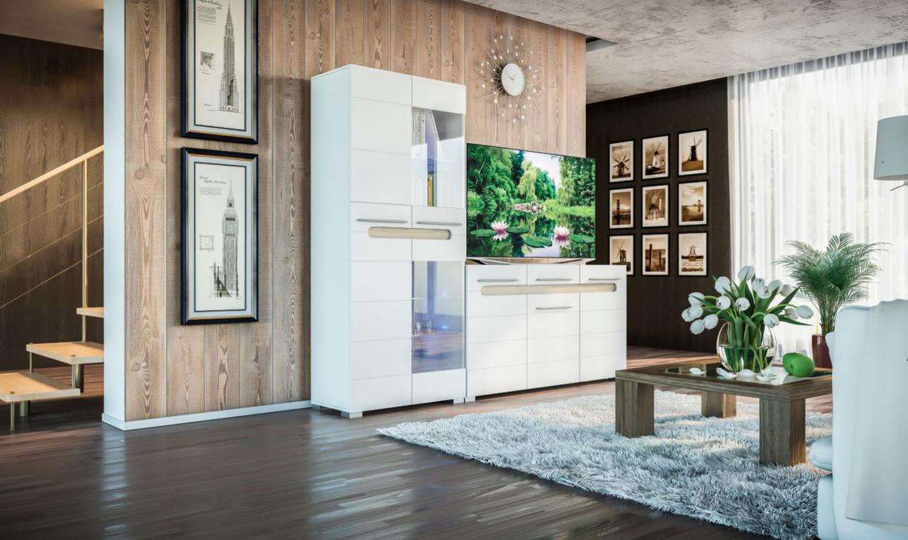 Современную стенку в гостиную из модулей можно приобрести в салонах — как отдельными модулями, так и полным комплектом. Чаще всего такая процедура осуществляется под заказ.