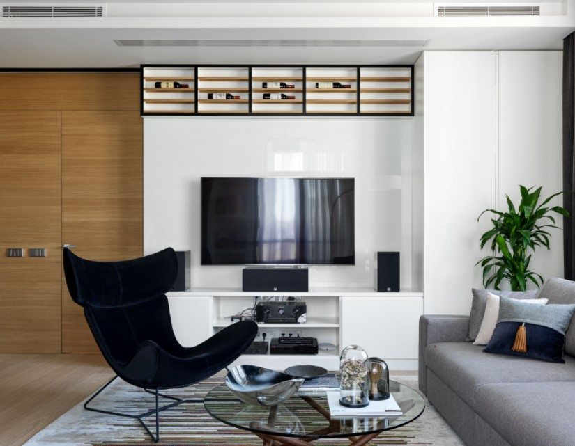 Телевизор может располагаться не только на тумбе, но и на полке или прямо на стене. Отталкиваться нужно только от предпочтений и параметров комнаты.