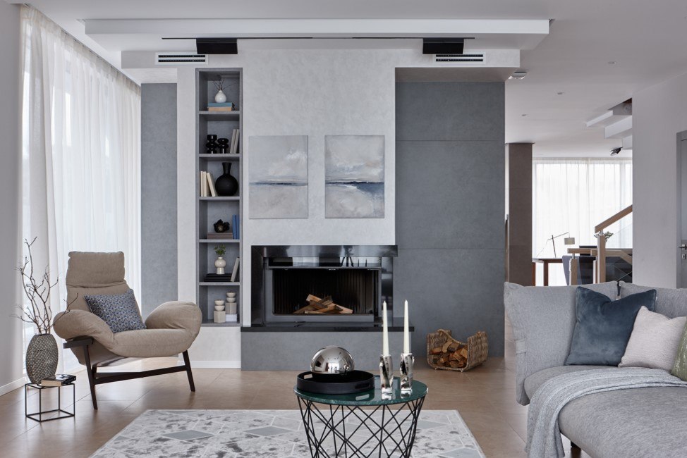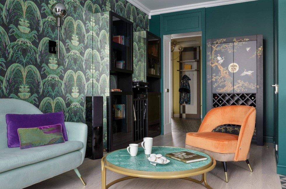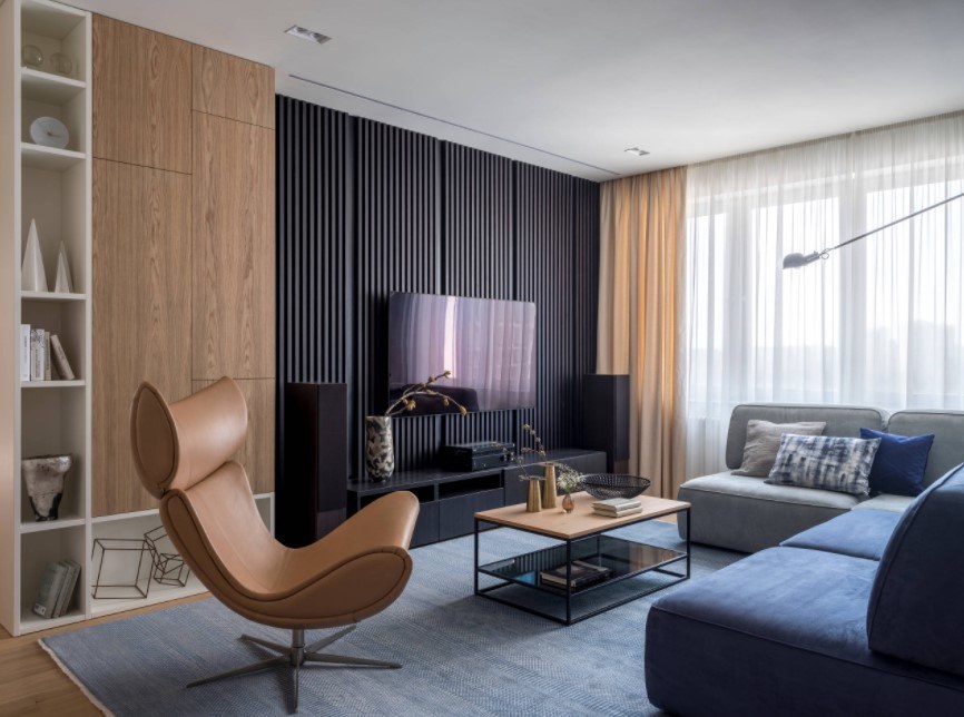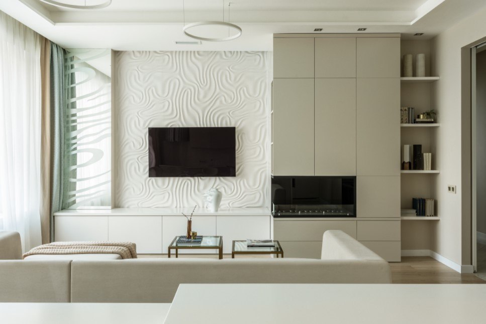 Фактурные фасады привлекают внимание и подходят для гостиной с однотонными стенами