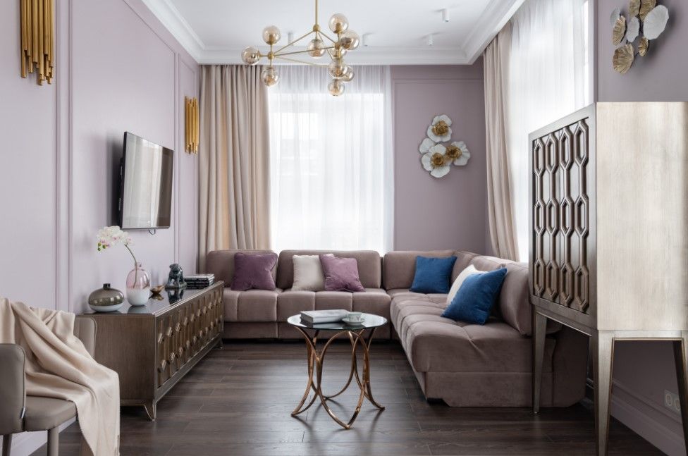 В зависимости от стилистического направления и выбранной цветовой гаммы гостиной осуществляется и выбор оттенков для исполнения мягкой мебели