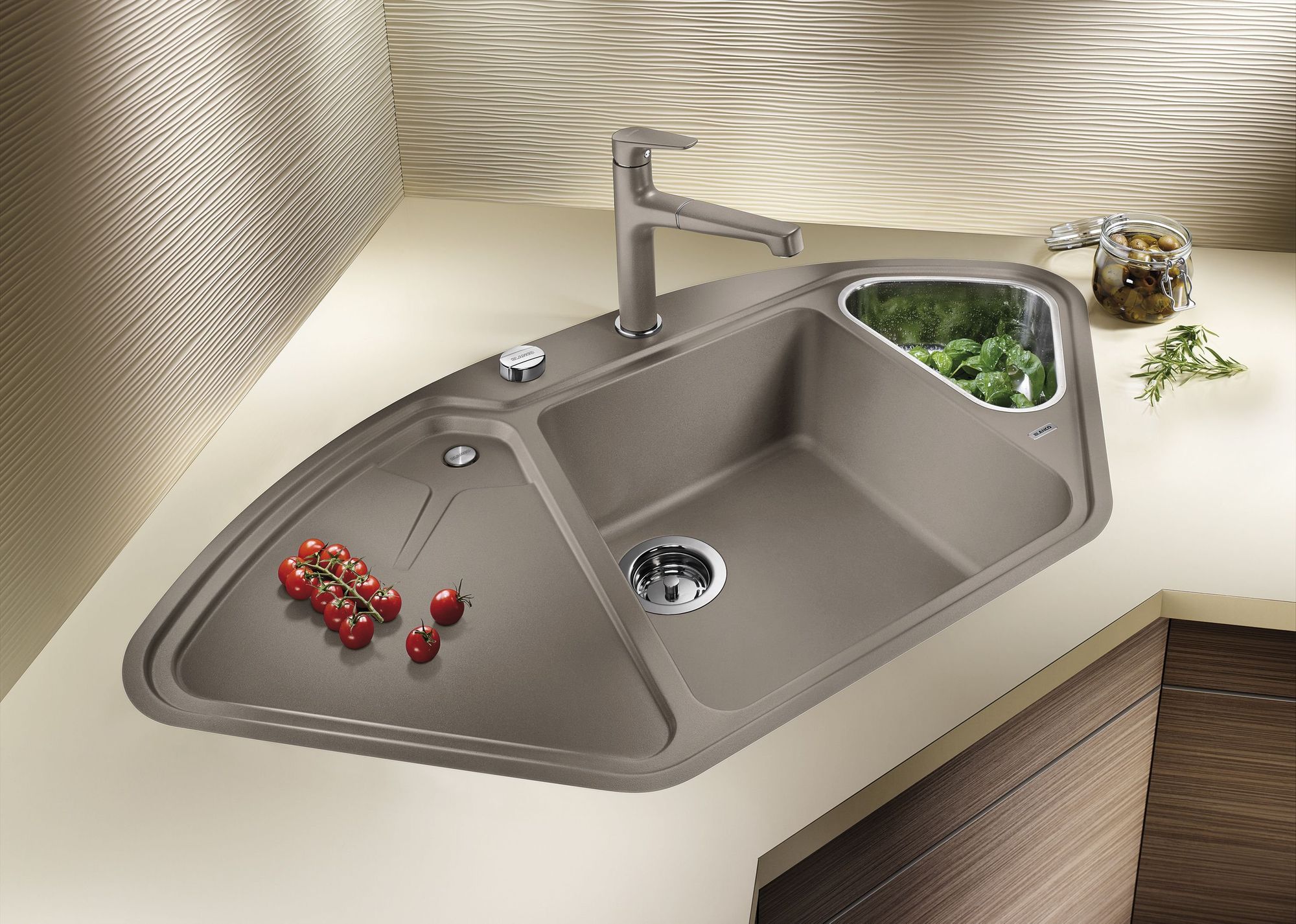 Пятиугольные и шестиугольные мойки — это современная форма, которая получается за счет дополнительных крыльев и секций. Эти мойки очень вместительны, могут монтироваться и в углах, и вдоль стены. Идеальны для больших кухонь.