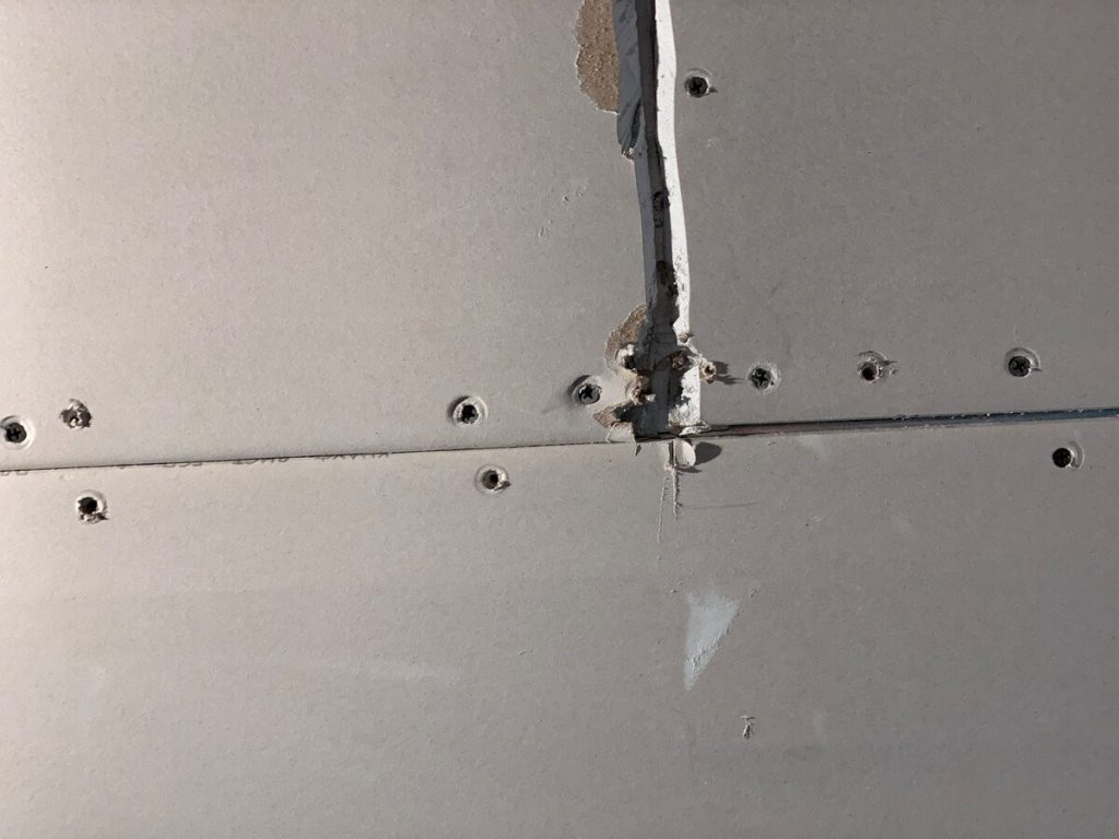 Вы наверняка знаете, как работать с гипсокартоном: в одной точке можно стыковать не более трех листов. То есть, крепить их нужно со смещением, чтобы швы получались не крестообразной, а Т-образной формы.