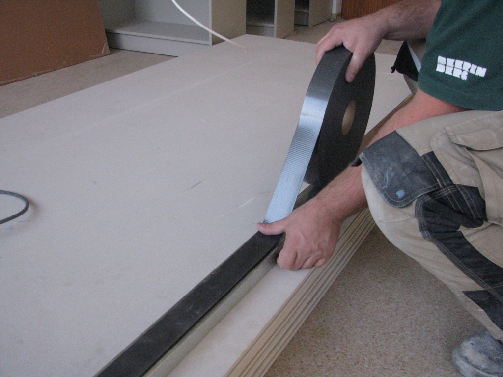 Для соблюдения норм звукоизоляции на каркас крепящийся к стенам, полам и потолку необходимо приклеить специальную демпфирующую прокладку.