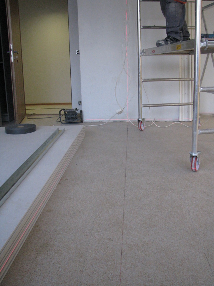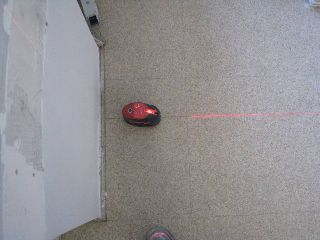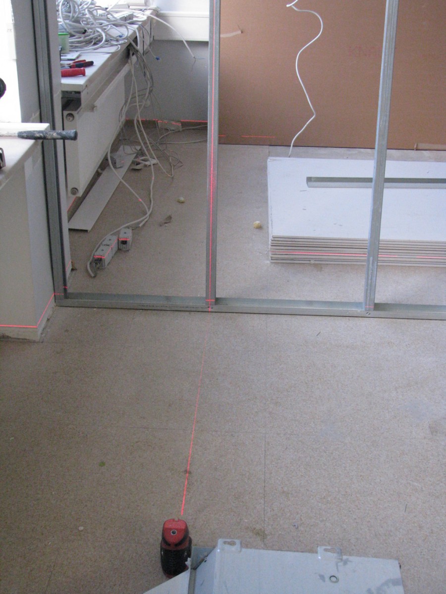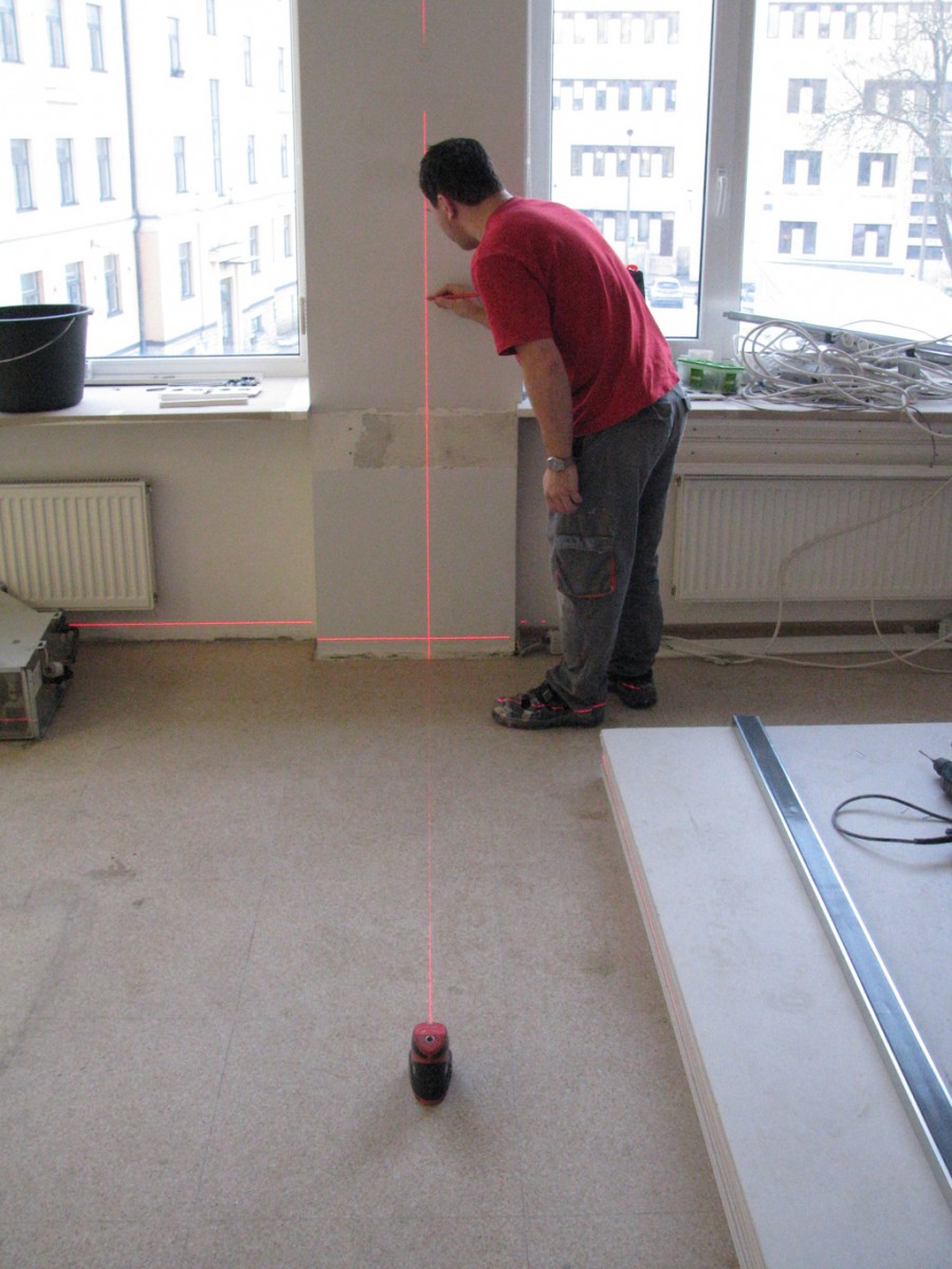 Поскольку для планируемого типа перегородки примыкание идет по вертикальной стене, полу и потолку, линии размечаются на каждой из поверхностей. Обязательно проверяется совпадение отметок на противолежащих поверхностях (полу и потолке), для этой цели используется отвес или лазерный уровень, поскольку обычным проверить точность не получится.