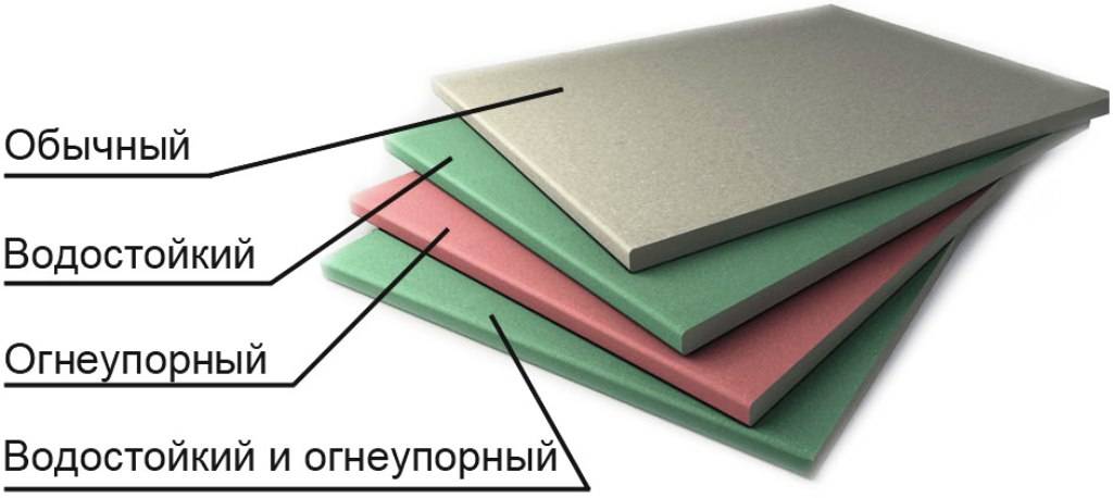 Гипсокартон делится на стандартный, влагостойкий и огнеупорный. Они отличаются по цвету и стоимости.