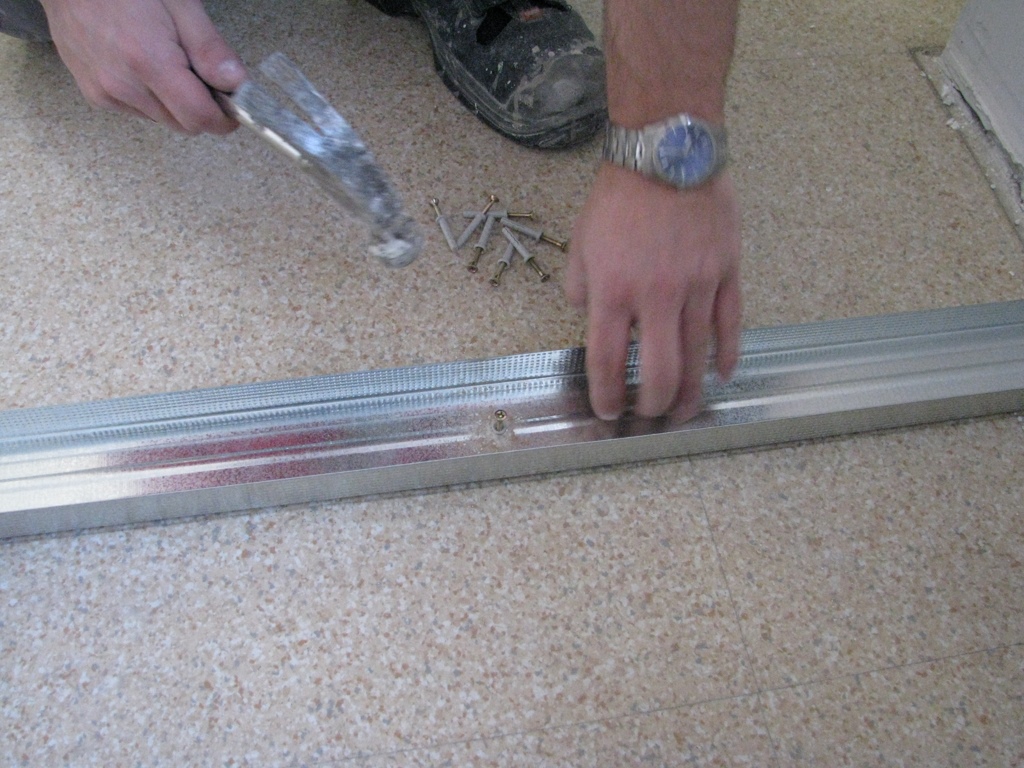 Выставляем направляющие по отметкам и прибиваем дюбелями к полу, если пластмаски не лезут добиваем их молотком, еще один момент — дюбеля могут как забиваться так и закручиваться.