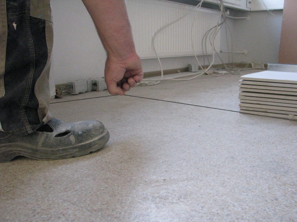 Метки соединяются с помощью шнура (толстой нити, окрашенной лески или ленты), это обеспечивает прямолинейность линий. Для нанесения линий можно использовать сам профиль.