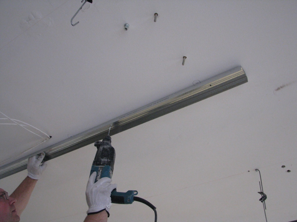 Закрепили. Как видно на фотографиях, у нас на полу и стенах основание твердое, а на потолке у нас были пенопластовые плиты, поэтому мы приспособились и сделали вот так.